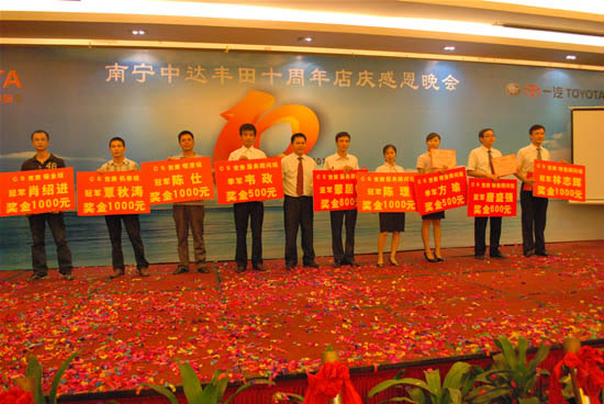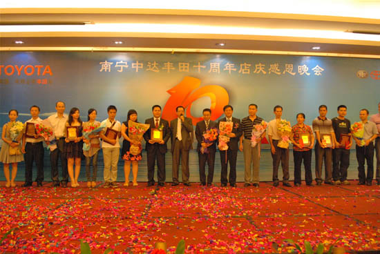 在9月6日舉行的十周年店慶晚會上,南寧中達豐田總經(jīng)理李偉峰先生向公司全體員工為公司發(fā)展所做出的貢獻表示感謝,同時為在公司連續(xù)服務(wù)滿十周年以上員工及其家屬頒發(fā)十周年忠誠員工獎及隆重謝禮。南寧中達豐田的十周年既是一個享譽各界的里程碑,也是邁向更加輝煌的起點。