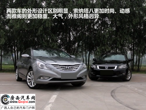 兩款車在外觀設(shè)計上很容易看出孰先孰后,索納塔的流體雕塑設(shè)計富有很強烈的現(xiàn)代氣息,時尚、運動,車身流線營造出非常強烈的動感。雅閣更加明顯的傾向于沉穩(wěn)、大氣,更加寬厚的車頭和平直的線條把車頭橫向拉伸的更加寬大,視覺效果也更加低矮。第八代的雅閣上市之初其造型也非常時尚、搶眼,無奈時間抹去了那時的炫麗而變得更加穩(wěn)重。