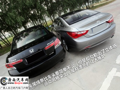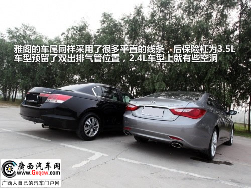 如果要在索納塔的外觀設(shè)計中找出最棒的部分,我會毫不猶豫的將票投給車尾,雖然車尾線條比車頭要簡單不少,但是卻勾勒出了非常有立體感的設(shè)計,運動風(fēng)格非常突出,尾燈造型甚至讓人有些嫉妒,加上左右雙出排氣尾管的配合,索納塔的車尾可謂高檔、運動與精致集于一身。相對而言,雅閣的車尾同樣采用了很多平直的線條,有著典型的日系車設(shè)計風(fēng)格。后保險杠為3.5L車型預(yù)留了左側(cè)排氣管的位置,2.4L的車型上這個部分就有些空洞,這是我們一直很在意的部分。