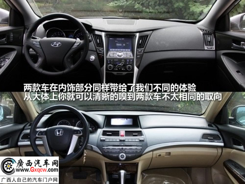 兩款車在內(nèi)飾部分同樣帶給了我們不同的體驗(yàn),從大體上你就可以清晰的嗅到兩款車不太相同的取向,索納塔的內(nèi)飾配色和充滿張力的內(nèi)飾線條都更加傾向于年輕人的審美標(biāo)準(zhǔn),無論是控制面板的背光還是細(xì)節(jié)部分的造型都特意營造一種科技與細(xì)膩并重的風(fēng)格。而曾一度作為同級(jí)內(nèi)飾標(biāo)桿的雅閣則偏重于舒適氛圍,當(dāng)然這種情況在深色內(nèi)飾的雅閣上并不見得還如此明顯(2011款雅閣高配車型提供黑色內(nèi)飾)。