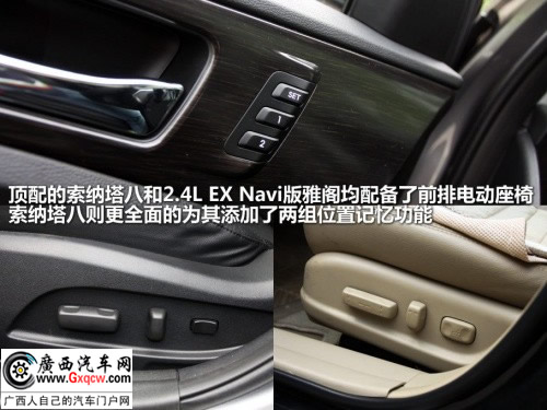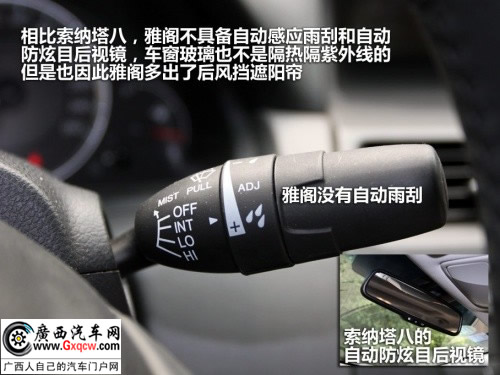 索納塔采用了防紫外線隔熱玻璃,所以相應(yīng)的就比2.4L EX Navi版的雅閣少了后風(fēng)擋遮陽(yáng)簾。兩款車都配備了自動(dòng)大燈,但索納塔連雨刮也是自動(dòng)的,兩款車的電動(dòng)折疊后視鏡也是索納塔多了自動(dòng)防眩目功能。