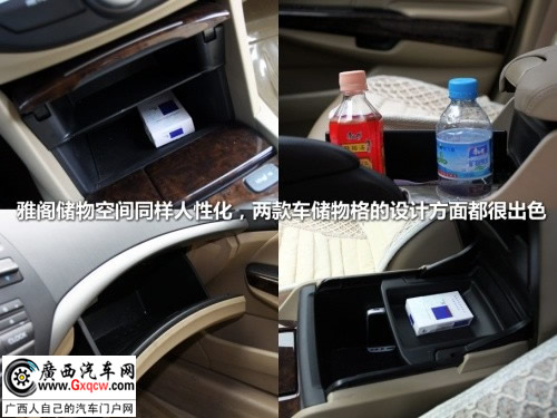車內(nèi)儲(chǔ)物格的設(shè)計(jì)對(duì)于這兩輛車來說都是強(qiáng)項(xiàng),但相比較之下,索納塔的儲(chǔ)物格更多、更大,除了四個(gè)車門的水杯架、儲(chǔ)物格、手套箱等常規(guī)的位置之外,索納塔在擋桿前方的儲(chǔ)物格是我們最常用的地方,地庫卡、臨時(shí)停車卡、香煙、錢包等等七零八碎的東西都被放在這里,而雅閣在此處雖然也備有儲(chǔ)物格,但是多出一個(gè)打開盒蓋的動(dòng)作讓我們這些懶人都覺得麻煩,所以我們對(duì)索納塔的儲(chǔ)物便利性更加滿意。
