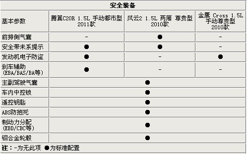 在安全配備方面,三車都配備了主副駕駛雙安全氣囊,風(fēng)云2還配備了前排側(cè)氣囊,這點(diǎn)對于提升整車的安全性方面尤為重要。同樣三車同時配備了時下流行的遙控鑰匙、鋁合金輪轂、車內(nèi)中控鎖等配置,而ABS、EBD等主動防御措置一樣也沒有少,但更進(jìn)一步的剎車輔助系統(tǒng)成了騰翼C20R的獨(dú)享,而安全帶未系提示及發(fā)動機(jī)電子防盜等配置的配備進(jìn)一步提升了長城騰翼C20R的購買值。