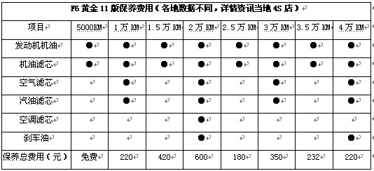 F6黃金11版提供整車2年或6萬公里保修,發(fā)動(dòng)機(jī)、變速器等核心部件提供最長(zhǎng)5年或10萬公里保修。如果以一年2萬公里計(jì)算,首保提供免費(fèi)服務(wù),第二次常規(guī)保養(yǎng)費(fèi)用約為220元,第三次更換機(jī)油機(jī)濾和火花塞約為420元,第四次保養(yǎng)(更換機(jī)油機(jī)濾、空調(diào)濾芯、空濾、變速箱油,助力油)費(fèi)用在600元以內(nèi),平均一年保養(yǎng)費(fèi)用花費(fèi)大概在1300元左右。