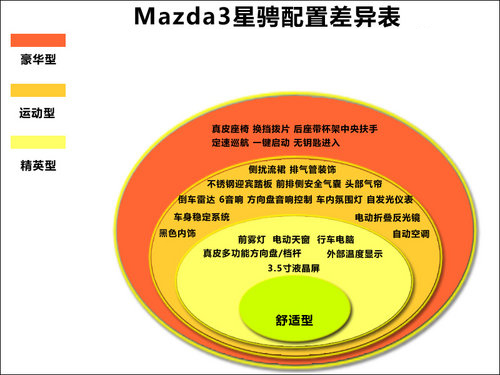 2011年9月16日,長安馬自達在第十四屆成都車展宣布Mazda3星騁正式上市。此次上市的車型共分為手動/自動舒適型、精英型、運動型、豪華型共計5款車型,價格區(qū)間則為11.28萬-15.38萬元。而在這5款車型中,究竟哪款車性價比最高,而哪款車又更具賣相呢?下面編輯就為您一一解答。