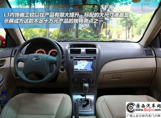內(nèi)飾方面,L3的整體風(fēng)格依舊是比較居家的感覺,中控部分上深下淺的設(shè)計(jì)也比較正統(tǒng),不過中控部分引入的一些仿金屬拉絲的設(shè)計(jì)倒是還比較時(shí)尚。另外,全系的大液晶屏配置也讓整車的感覺更加高檔了些,另外高配車型還引入了多功能方向盤,本次上市的兩款CVT車型全系標(biāo)配無鑰匙啟動(dòng)、倒車可視系統(tǒng)、倒車?yán)走_(dá)、自動(dòng)感應(yīng)大燈、電動(dòng)調(diào)節(jié)外后視鏡等等,給人的感覺是自主品牌在這些細(xì)節(jié)配置方面有了很大程度的提高。在安全配置方面,L3也配備了ABS(EBD)、前排雙氣囊、前排側(cè)氣囊(高配車型)等安全配置,雖然不如奇瑞A3率先引進(jìn)了ESP,但是對(duì)于這一價(jià)位的自主車型來說也已經(jīng)很厚道了。