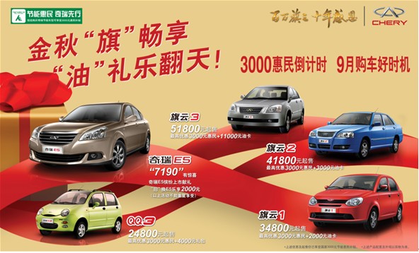 濃情9月,為感謝廣大用戶對奇瑞汽車的長期關(guān)注與支持,奇瑞旗云事業(yè)部攜手旗下系、東方之子等經(jīng)典節(jié)能車型,邀您共載節(jié)能惠民“末班車”。