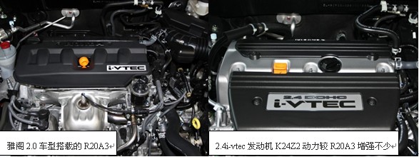 雅閣2.4L車型搭載的發(fā)動(dòng)機(jī)不是由2.0L車型簡單擴(kuò)缸而來,這款發(fā)動(dòng)機(jī)型號為K24Z2,動(dòng)力性能較2.0L的R20A3強(qiáng)出不少,但同時(shí)油耗也相應(yīng)增加,平均百公里油耗達(dá)到了11.65升。