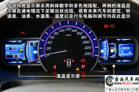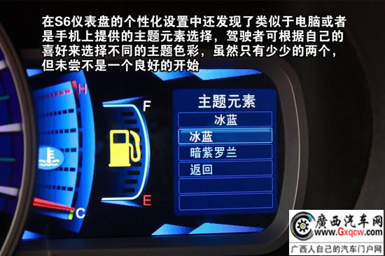 儀表盤乃是S6的亮點之一,由傳統(tǒng)的指針式儀表盤和兩塊4.3寸的液晶屏相組合,在通電的情況下,液晶屏點亮并呈現(xiàn)推出狀顯示,很有未來汽車的感覺。豐富的車輛信息能夠讓駕駛者更為全面的知曉車輛狀況。在儀表盤的菜單中,筆者發(fā)現(xiàn)了S6的儀表盤還提供了兩種主題元素可供選擇,通過選擇不同主題元素使得儀表盤變換不同顏色,雖然只是很少的兩種,但未嘗不是一個好的開始,而且在自主品牌的車型中,這應(yīng)該算是一次非常大膽的創(chuàng)新了。