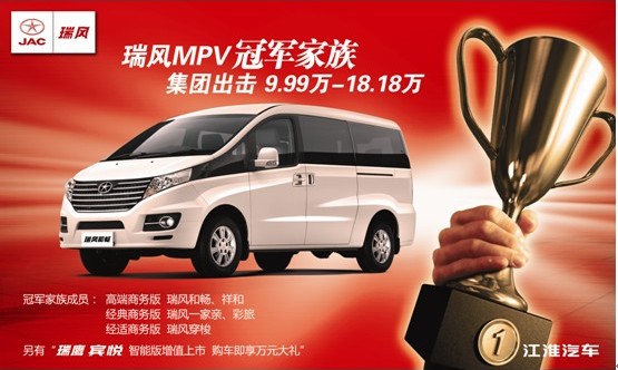 在金九銀十這個(gè)黃金銷售時(shí)期,瑞風(fēng)MPV冠軍家族集團(tuán)出擊,高端商務(wù)版瑞風(fēng)和暢、瑞風(fēng)祥和系列18.18萬(wàn)—14.98萬(wàn),經(jīng)典商務(wù)版瑞風(fēng)一家親、瑞風(fēng)彩旅系列13.48萬(wàn)—11.98萬(wàn),經(jīng)適商務(wù)版瑞風(fēng)穿梭系列10.58萬(wàn)—9.99萬(wàn),可靠的品質(zhì)、豐富的品種和健全的售后服務(wù),使得瑞風(fēng)繼續(xù)穩(wěn)坐國(guó)內(nèi)MPV市場(chǎng)的冠軍寶座。