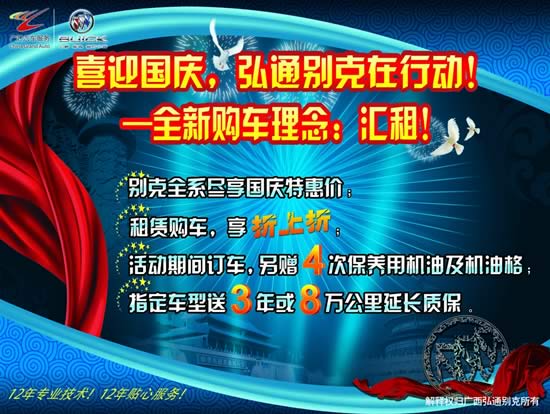 九月安吉秋季汽車交易會(huì)剛剛結(jié)束,車市余熱未消,廣西汽車市場旁的弘通別克將在展廳內(nèi)舉行歡度國慶“匯租”惠民活動(dòng),這將再次掀起一股別克購車狂潮。