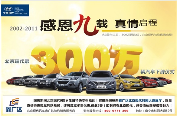 北京現(xiàn)代汽車鑫廣達(dá)特約銷售服務(wù)店 地址:南寧市高新區(qū)科園大道59號 銷售服務(wù)熱線:400 0771 399