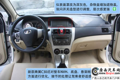作為一款標(biāo)準(zhǔn)的家用車,騰翼C30的內(nèi)飾采用了濃厚的家居化設(shè)計理念,上深下淺的配色營造出非常溫馨的生活氣息,給人的感覺也非常舒服。