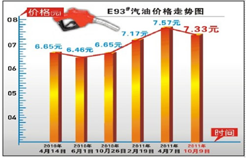 據(jù)了解,去年6月1日,成品油有過(guò)一次下調(diào),當(dāng)時(shí),E93#汽油較此前價(jià)格下降了0.19元/升,E97#下降了0.20元/升,E90#下降了0.18元/升。下降后, E90#汽油每升6.02元,E93#每升6.46元,E97#每升6.98元。然而,這輪降價(jià)只持續(xù)了不到20天的時(shí)間,到了6月20日,成品油價(jià)格再次邁開(kāi)步伐向上漲。此后歷時(shí)16個(gè)月,又經(jīng)歷了數(shù)次上漲,直至2011年10月9日才首次出現(xiàn)下調(diào)。此次下調(diào)后,較去年6月1日的價(jià)格,E90#汽油每升的最高零售價(jià)格上漲了0.81元,E93#每升上漲了0.87元,E97#的漲幅最大,每升上漲了0.94元。