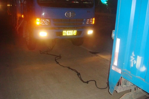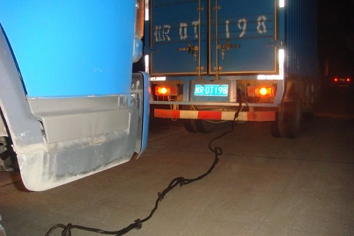 當日晚上20許,廣西高速交警十三大隊巡邏民警巡邏至轄區(qū)K462處時,發(fā)現(xiàn)前方有輛大貨車在緊急車道內(nèi)并打開著雙閃燈,民警判斷該車可能出現(xiàn)了故障,于是靠邊停下在后方進行警戒。當民警上前了解情況時,驚訝的發(fā)現(xiàn)此故障車前竟有一輛大貨車僅利用一根繩索正在拖拽著故障車,高速公路上是嚴禁像此類非專業(yè)救援車清障車拖拽,而且高速公路上行車車速過快,情況十分危險,如不及時制止其違法行為后果不堪設想。民警迅速指揮兩車駕駛員將車停在安全位置,然后詢問原因。后車駕駛員李某稱自己的車在高速路上發(fā)生故障以致于不能正常行駛,由于擔心施救費用高,便沒有報警,正好與同路的貨車司機將車拖著行駛,不料才拖了不到一公里就被高速交警制止了。