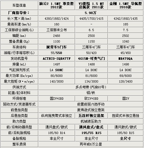 2012款旗云2與10月12日正式上市。新車此次根據(jù)配置差異共推出了五款車型,繼承老款1.5L發(fā)動機(jī)。2012款旗云2的官方指導(dǎo)價為4.78-5.98萬元。其中性價比最高的尊貴型售價為5.98萬元,今天我們找出三款同為5.98萬的自主車型,主角為新旗云2、V3菱悅、金剛,同為5.98萬!您會相中哪款呢?