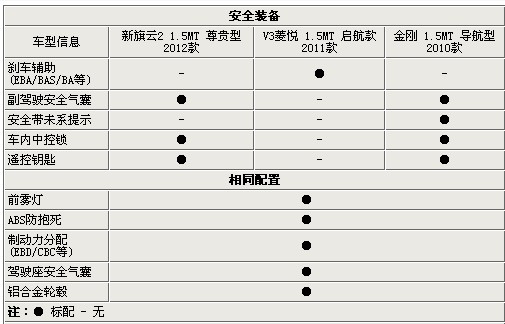 三車主動安全方面ABS+EBD和被動方面的主駕駛席安全氣囊成為了三車的共同裝備,鋁合金輪轂和前霧燈也成為了三者的標(biāo)配。V3菱悅的剎車輔助與另外兩車的副駕安全氣囊各有側(cè)重,但車內(nèi)中控鎖和遙控鑰匙則成為了另外兩車型的安全與實用的兼得裝備(雖然這兩項汽配市場幾百元就能解決,但動了大線的拆卸有些不妥),其中金剛的唯獨配備的安全帶未系提示作用非同一般。