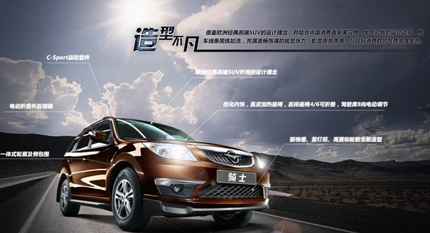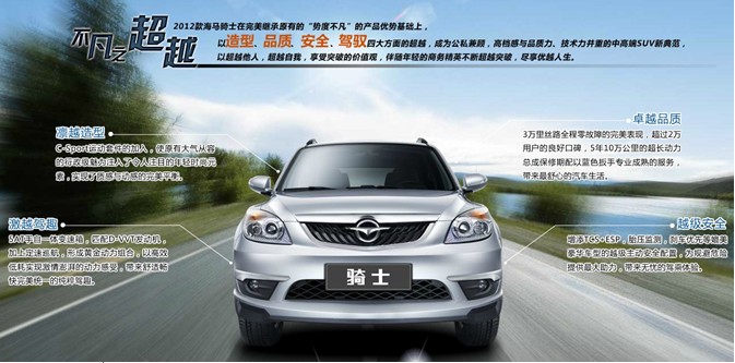 海馬騎士2012款定位為都市SUV中的“硬派紳士”,寓意其剛柔并濟,內(nèi)外兼修,擁有大氣、硬朗的“行政級”商務氣質(zhì),同級別都市SUV中最過硬的越野性能、安全保障和品質(zhì)。能完美滿足公商務以及個人、家庭使用的多種需求,伴隨都市精英拓展生活界限,在成功路上不斷超越。