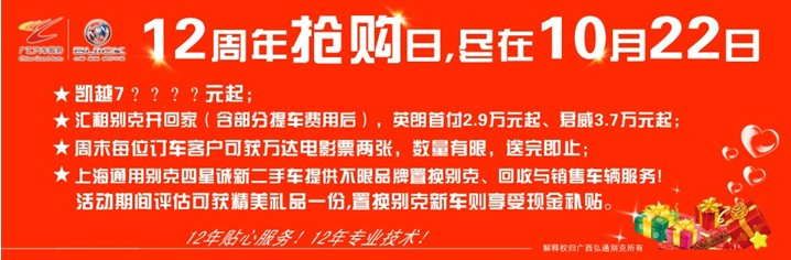 更多更詳細(xì)的促銷信息敬請各位車友“hold住”12周年安吉弘通別克!報名熱線3113918(南寧)、2996118(百色)、4580958(貴港)。