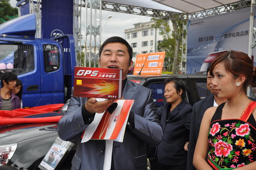 “恭喜這位觀眾,找到了藏在薩普里的獎品——GPS導(dǎo)航儀一臺……”在福田汽車的展位上,正在進(jìn)行的是福田“歐馬可-薩普尋寶奇兵”主題活動。每當(dāng)福田汽車經(jīng)銷商的銷售顧問講解車型知識的時候,總有很多細(xì)心的觀眾開始偷偷記下要點(diǎn)和賣點(diǎn),準(zhǔn)備回答后面的車型問答。在主持人的和現(xiàn)場觀眾朋友的見證下,先后有5位答對問題的觀眾在薩普車中找到了導(dǎo)航儀、遮陽傘等禮品,他們的臉上洋溢著喜悅的笑容。