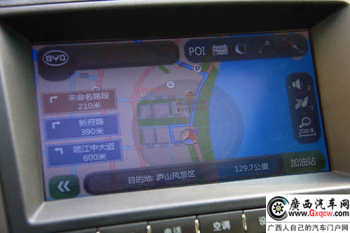 中控臺(tái)使用了7英寸彩色多媒體顯示屏,采用多點(diǎn)觸屏技術(shù),分辨率非常高,操作起來(lái)非常方便。這個(gè)彩色顯示屏的功能也很強(qiáng)大,除了傳統(tǒng)的DVD播放外,還能觀看CMMB數(shù)字電視和藍(lán)牙無(wú)縫鏈接手機(jī),而GPS導(dǎo)航系統(tǒng)對(duì)于日常用車更為實(shí)用。這套導(dǎo)航系統(tǒng)設(shè)計(jì)得也很人性化,直線行駛時(shí)能顯示方位以及周邊信息,而當(dāng)進(jìn)入彎道時(shí)會(huì)提前在地圖顯示轉(zhuǎn)彎位置,反應(yīng)速度比較快,基本上不會(huì)讓您錯(cuò)過(guò)路口。