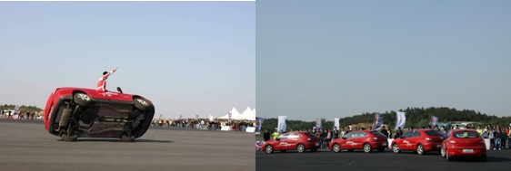 在挑戰(zhàn)賽開始前,由多次征戰(zhàn)中國汽車拉力錦標賽(CRC)的賽車手駕駛A3進行的特技表演秀首先上演,只見4輛A3首先以繞場自由行駛一圈的形式亮相全場。而后迅速排成首尾銜接的一列,組成了一條長長的車龍在場地中穿行游走。在完成了多趟蛇形穿樁之后,4輛A3又分成兩兩一組,在場內玩起更加驚險的交叉蛇形穿樁表演。最后,隨著觀眾的掌聲,伴著主持人的解說,車隊在場地內展示了難得一見的汽車“單邊飛行”特技表演,將本次表演推向高潮。一時間場地內人頭攢動,現場人氣不斷高漲,賽車轟鳴聲與人群吶喊聲在室外的露天廣場上此起彼伏。