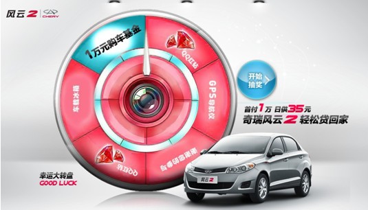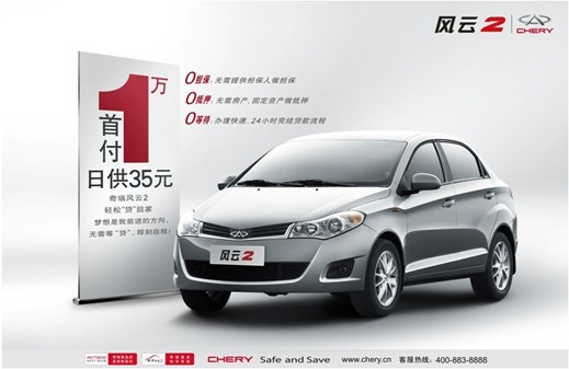 同時,為迎合目標消費者購車需求,奇瑞風云2自11年9月起,隆重推出“首付1萬 日供35元 奇瑞風云2輕松‘貸’回家”車貸活動,相比銀行車貸、信用卡車貸等形式,奇瑞風云2輕松“貸”活動大大降低了貸款門檻---無需提供擔保人做擔保、無需房產(chǎn)或固定資產(chǎn)抵押,并且具備辦理快速的特點,使購車和貸款一次性完成,方便快捷。風云2輕松“貸”活動低門檻、低日供的特點,讓流動資金有限的年輕消費群體能夠提前實現(xiàn)購車夢,盡享馳騁的快樂。