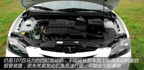 本次延長款的推出屬于小改款,動力方面依舊沿用了原來的1.6L自然吸氣四缸發(fā)動機,最大輸出功率為107馬力,峰值扭矩達到146N·m,匹配5速手動或4速手自一體變速器。不過,與發(fā)動機息息相關(guān)的一項配置被減去了,發(fā)動機蓋鎖防盜裝置雖然成本也不是很高,但至少能對行車安全起到不小的作用,尤其是那些馬虎的車主。除此之外,馬自達3延長款還更換了與馬自達3星騁相同的轉(zhuǎn)向節(jié)、制動盤、后減震器以及驅(qū)動軸,相同的共用結(jié)構(gòu)降低的成本。