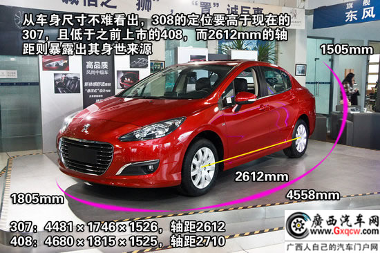 首先我們先來看一下標(biāo)致308的整車尺寸,東風(fēng)標(biāo)致308的車身尺寸為4558x1805x1505mm,軸距為2612mm。從車身尺寸來看,標(biāo)致308相比于307車型而言,除了整車身高度稍微低了一些外,在長、寬尺寸方面都有所增加。