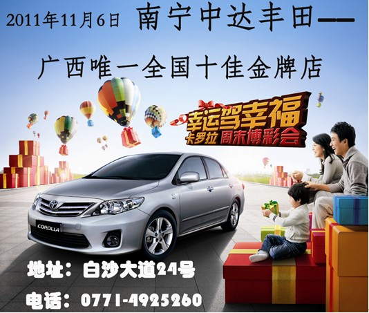 凡是在11月1日——11月6日15:00之前在白沙大道24號的南寧中達豐田購買卡羅拉的客戶,均可參與南寧中達豐田在11月6日舉辦的“幸運駕幸福,周末博彩會”活動。即有機會參加短信寫幸運、“男人幫”趣味博彩、飛鏢博彩、競價博彩等趣味游戲贏大獎。另外,購買卡羅拉指定博彩車型即有機會在原有優(yōu)惠購車價格的基礎上贏取再降一萬五千元的大獎。還有4000元車險等其他獎項等您趣味領取哦!