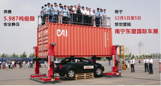 一次現(xiàn)場(chǎng)測(cè)試中,在全國(guó)幾百位記者的見(jiàn)證下,奔騰B70承受了5.987噸的集裝箱靜壓。這重量超過(guò)了奔騰整車重量的4.1倍,也超過(guò)了國(guó)家安全標(biāo)準(zhǔn)2.7倍之多,而車身結(jié)構(gòu)卻絲毫沒(méi)有變形,就連車上的玻璃窗沒(méi)碎,車門還可以輕松自如的打開(kāi)。在場(chǎng)媒體觀眾無(wú)不為之贊嘆,更有踴躍的觀眾強(qiáng)烈親身坐入該車內(nèi)體驗(yàn)感受靜壓過(guò)程。