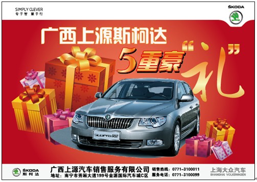上海大眾斯柯達(dá)白金級經(jīng)銷商廣西上源4S店在11月期間,隆重推出進(jìn)店購車五重豪“禮”!