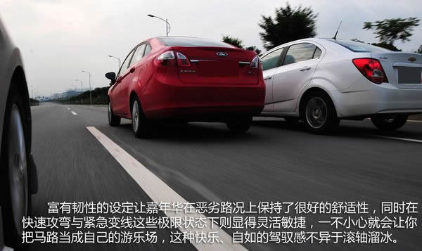 很明顯嘉年華在三車?yán)锩孀顚?duì)得起“運(yùn)動(dòng)”這一個(gè)名號(hào)。緊湊的車廂氛圍在駕駛者與車身之間建立起豐富的溝通,轉(zhuǎn)向比例直接得幾乎讓每一丁點(diǎn)的方向盤轉(zhuǎn)角都能帶來(lái)車頭的反饋,是的,嘉年華在執(zhí)行指令時(shí)果斷得就像一個(gè)忠心的衛(wèi)士。當(dāng)然,它的絕招還是那一副矯健的身手,雖然僅僅是同級(jí)常見(jiàn)的前麥弗遜后扭力梁式組合,但富有韌性的設(shè)定讓嘉年華在惡劣路況上保持了很好的舒適性,同時(shí)在快速攻彎與緊急變線這些極限狀態(tài)下則顯得靈活敏捷,一不小心就會(huì)讓你把馬路當(dāng)成自己的游樂(lè)場(chǎng),這種快樂(lè)、自如的駕馭感不異于滾軸溜冰。