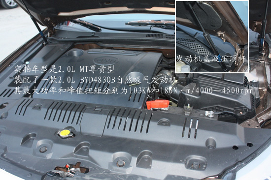 實(shí)拍車型是2.0L MT尊貴型,裝配了一款2.0L BYD483QB自然吸氣發(fā)動(dòng)機(jī),其最大功率和峰值扭矩分別為103KW和186N·m/4000—4500rpm。但G6主打的是1.5T發(fā)動(dòng)機(jī)。搭載1.5TI渦輪增壓直噴發(fā)動(dòng)機(jī)的比亞迪G6額定功率達(dá)到113 kW /5200 rpm,最大扭矩240 Nm /1750-3500 rpm,升功率75.4 kWL,升扭矩160.4NmL,相比大眾的1.4TSI還高出一截,甚至也超過了2.0L排量的自然吸氣式發(fā)動(dòng)機(jī)。