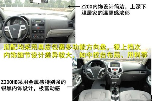 除去外型上的差異,Z200和Z200HB在內(nèi)飾設(shè)計中差異化也極為明顯。Z200內(nèi)飾氛圍設(shè)計內(nèi)飾簡約實用,工藝精致細(xì)膩,上深下淺的顏色搭配所帶來的溫馨感也非常符合家用車的特點。Z200HB的內(nèi)飾大量的采用了銀灰色的鍍鉻裝飾,金屬質(zhì)感十足,尤其是盾形中控臺極富力量性,加行三角形的多功能方向盤,那種讓人血脈噴張的運動侵略性哄然而出。