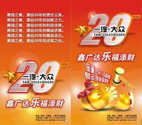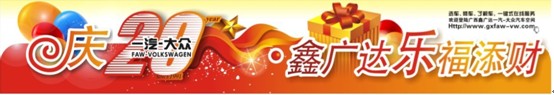 為感謝二十年來消費者對一汽-大眾德系品牌長期來的支持與厚愛,鑫廣達一汽-大眾4S店將在11月12-27日啟動盛大的“慶一汽-大眾20周年 ● 鑫廣達送您樂福添財”感恩回饋促銷活動,凡在11月12、13、19、20、26、27日(活動期間逢周六、日)到店訂購車的客戶均可參與“砸金蛋”抽獎(除GOLF6、cc)。100%的中獎機率,高達千元的現金大獎等你來“砸”,更有令人心動的促銷政策等你來揭曉!