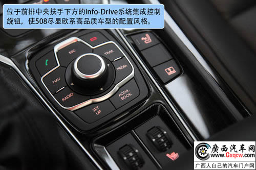 擋把位置后方有一個類似于寶馬iDrive的人機交互系統(tǒng),這也是標致508的一大亮點,如此的設計使得508成為同級別車型中的佼佼者。