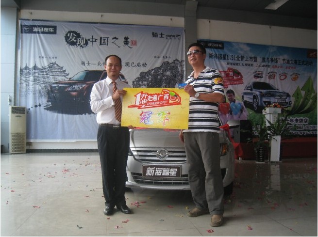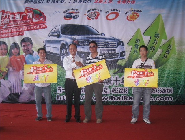11月13日,海馬汽車南寧?凳昀吓频暝诤?蛋咨4S舉行了“連升三級(jí)、幸福油禮 新海福星上市發(fā)布會(huì)”。于此次發(fā)布會(huì)上,同時(shí)舉行了“1升油走遍廣西、海福星節(jié)油挑戰(zhàn)賽”活動(dòng)。據(jù)悉此次節(jié)油賽自11月13日開(kāi)始,至12月下旬結(jié)束。將分別通過(guò)初賽及決賽兩個(gè)階段,決出真正的“節(jié)油冠軍”。初賽在各地市單獨(dú)舉行,決賽將于12月底在南寧舉行。新海福星上市活動(dòng)當(dāng)天即舉行了南寧地區(qū)初賽,在活動(dòng)中,一等獎(jiǎng)海馬車主劉黎慶先生節(jié)油出彩全程城市綜合道路工況42公里僅需2.05L,刷新海福星油耗記錄!向他祝賀的同時(shí),也預(yù)祝在下個(gè)月底廣西海福星總爭(zhēng)霸賽中取得佳績(jī),屆時(shí)廣西 “節(jié)油先鋒”共同角逐,“節(jié)油車神”將會(huì)誕生,我們翹首以待!