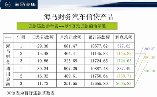 普通貸款:所有海馬車型均可貸款,首付30%及以上,期限為1~3年,還款方式為等額本息即每月還款金額相同。