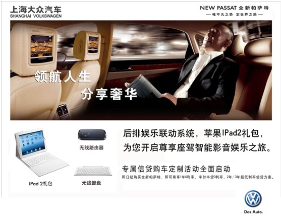 上海大眾廣西眾源4S店全新帕薩特車型現(xiàn)車充足,即日起到店搶購全新帕薩特車型即可搶先享受東盟車展特惠政策,獲贈全新帕薩特專屬258800元豪華大禮包。包括后排娛樂聯(lián)動系統(tǒng)套裝組合,以及蘋果Ipad2禮包等,為您開啟尊享座駕智能影音娛樂之旅。