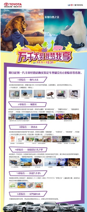 2011.11.1——2011.12.31期間,只要選購(gòu)皇冠、銳志、RAV4、卡羅拉、花冠、威馳這6款車型之一,便可獲贈(zèng)價(jià)值1000~2500元不等的購(gòu)車禮包。凡購(gòu)車成功者均可參加抽獎(jiǎng)活動(dòng),幸運(yùn)中獎(jiǎng)?wù)哌可獲得價(jià)值2000~4999元不等的團(tuán)圓飯禮劵、春節(jié)大禮包、西藏觀光行、香港迪士尼新年游覽之旅或搭乘豪華郵輪游覽日韓、東南亞的機(jī)會(huì)。另外,您還可以通過參與《時(shí)尚旅游》雜志的征稿活動(dòng),獲取成為明年4月北極之旅或非洲之旅特約報(bào)道員的機(jī)會(huì)。