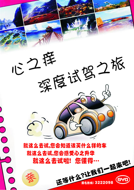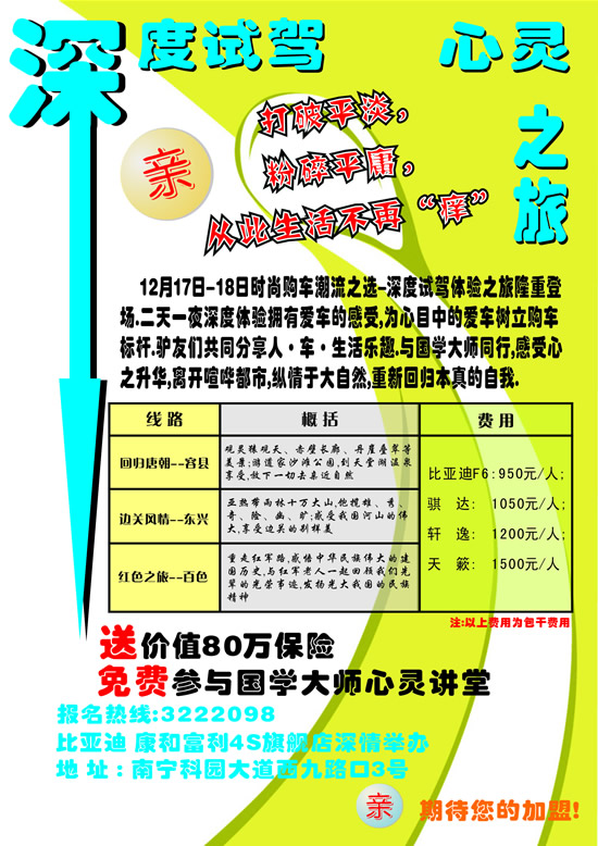 比亞迪康和富利12月24日-25日時(shí)尚購(gòu)車潮流之選-深度試駕體驗(yàn)之隆重場(chǎng),兩天一夜之旅,三個(gè)不同城市讓你玩,深度體驗(yàn)擁有愛車的感受,為心目中的愛車樹立購(gòu)車標(biāo)桿,驢友們共同分享人、車、生活樂(lè)趣,與國(guó)學(xué)大師同行,感受心之升華,離開喧嘩的都市,縱情于大自然,重新回歸本真的自我!還猶豫什么?趕緊拿起電話報(bào)名吧!