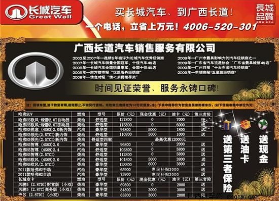 矩惠車型:(本活動(dòng)車型、油卡數(shù)量有限,送完即止,不做另行通知)本活動(dòng)最終解釋權(quán)歸廣西長道汽車銷售服務(wù)有限公司所有。