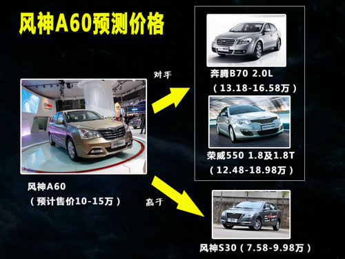 明年上半年上市的風(fēng)神A60在產(chǎn)品定位上要高于風(fēng)神S30(官方指導(dǎo)價(jià):7.58-9.98萬),加上合資技術(shù)的成本因素,相對(duì)于競(jìng)爭(zhēng)對(duì)手奔騰B70的2.0L車型(13.18-16.58萬)與榮威550的1.8L及1.8T(12.48-18.98萬),上市后A60的2.0L車型的預(yù)計(jì)價(jià)格區(qū)間為10-15萬元,而1.6L車型的價(jià)格將會(huì)進(jìn)一步拉低其售價(jià),很可能進(jìn)入10萬以內(nèi)的價(jià)格區(qū)間。