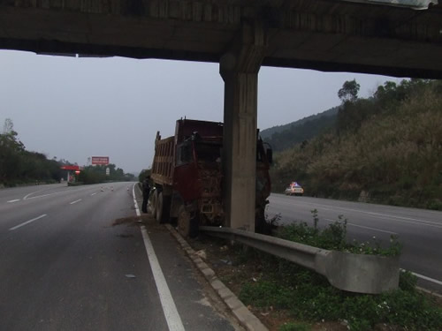 2011年12月9日早7時,一名貨車司機因行車途中打起瞌睡,迷迷糊糊中導(dǎo)致車輛失控撞向高速公路立交橋墩上,造成車輛嚴重損壞,所幸人員無傷亡,事發(fā)泉南高速公路伶俐立交橋下路段。