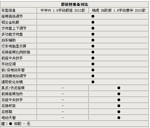 對比完安全性,我們再來看看兩車的舒適性。經(jīng)對比,瑞虎的優(yōu)勢完全地表現(xiàn)出來。座椅高低和方向盤調(diào)節(jié)、多功能方向盤、手動空調(diào)及電動調(diào)節(jié)外后視鏡成為了兩車共同配置。而其他舒適性的表現(xiàn),瑞虎的電加熱的真皮座椅對于北方的寒冷的冬天來講可謂非常有幫助、集成中央扶手的后排被托架及電動天窗的配備可謂是舒適至極,這也間接地拉平了瑞虎與V5在安全上的懸殊差距。