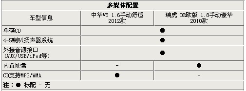 因為兩款車都屬于中低配車型,所以,區(qū)分各車型最明顯的多媒體配置令兩款車配置優(yōu)勢都不是很明顯,基本上都屬于入門級裝備。其中,單碟CD和外接音源接口的裝置成為了兩款車的共同配置,而奇瑞瑞虎獨有的內(nèi)飾硬盤對于消費者應(yīng)急時擴展容量有所幫助,而V5支持MP3和WMA功能的CD來講確實很強大。
