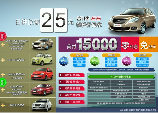 在超前消費的當代,貸款購車已成為都市E族的時尚消費觀。奇瑞E5此次貸款活動,不僅為車主提供了多種套餐選擇,優(yōu)惠政策的門檻也很低,用戶憑身份證、收入證明等有效證件便可享受到自主科技家轎“新貴”的人本科技魅力,本次活動截止日期為12月31日,請有貸款購車需求的朋友抓緊時間,以免錯過最后機會!