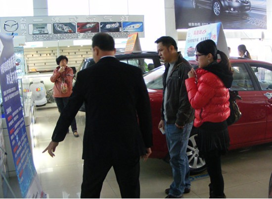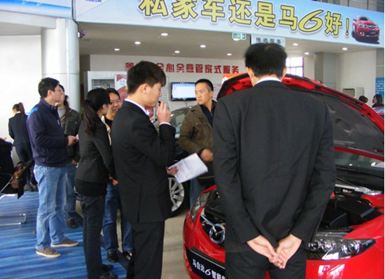 銷售顧問(wèn)激情飽滿的為現(xiàn)場(chǎng)的客戶朋友做智能版馬六的性能介紹