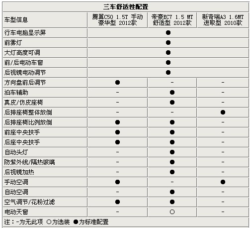 三款車型中區(qū)別最大的莫過(guò)于三車的舒適性表現(xiàn),電動(dòng)調(diào)節(jié)外后視鏡、行車電腦顯示屏、大燈高度調(diào)節(jié)等實(shí)用型配置一應(yīng)俱全。除了EC7裝備有倒車?yán)走_(dá)外,其余兩款車型均為配備,另外,自動(dòng)頭燈、防紫外線隔熱玻璃、后視鏡電加熱、自動(dòng)空調(diào)等方面的配置領(lǐng)EC7在舒適便利性方面遙遙領(lǐng)先與其他兩款車型。于此同時(shí)C50的后排座椅按比例放倒和空氣調(diào)節(jié)功能等差異化表現(xiàn)更勝A3一籌。